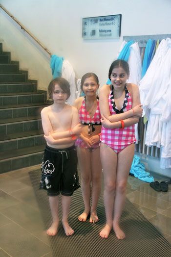 It's hard to believe that we are all bundled up in our warmest winter coats in this picture - and we are on our way to swim outdoors!