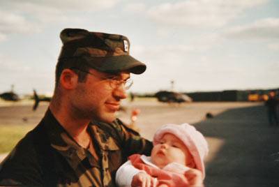 My husband Matt is not active duty anymore, but was an army helicopter test pilot for the first 6 years of our marriage. We were stationed in Germany when Matt got deployed to Kosovo. It was 2000, and during that time our first daughter was born. I came back to Germany to our home about one month before Matt was coming home from Kosovo. Isabella was three months old when we moved from Finland to Germany, and I was so excited to be back. It was springtime, and the weather was nicer in Central Europe than what it had been in Finland, my baby was healthy, happy and growing well, and I was ready to go back home. And more importantly, I was ready to see my husband again, and start our life together as a family. It had been lots of nightless nights with a newborn and worrying about Matt being in Kosovo, but once we got back to Germany I felt much closer to Matt.I remember the weeks before the Homecoming Day being full of happiness, and excitement. I counted days and hours for Matt's arrival, and I wanted everything at home to be perfect. I sewed Isabella a dress that said "I (heart) Dad" in the front for the Homecoming Day. I embroidered the little heart in it. I think Matt probably thought it was the dorkiest little dress ever, but I didn't care. I needed to keep my days busy, so I also knitted little sweaters and made scrapbooks and the house was so clean that you could eat from the floors. I was like an Energizer Bunny charged with Homecoming Happiness. I was nesting probably more than I had before the baby was born.Then it was the Homecoming Day.Matt's unit was flying their helicopters in in a formation, and their arrival was set for noon. I changed my clothes probably like five times that morning. Even though I had planned my outfit already a week ago. And you know what happens when you are trying to leave a house with a four month old - yeah, it happened, right when we were leaving, and I had to stay for another diaper change.And I totally missed seeing Matt to land his helicopter.On a Homecoming Day.After he had been in Kosovo for six months.We arrived to the air field after the rotors had stopped spinning, and after every one else had said their teary eyed hellos. I'm sure Matt was disappointed, but he didn't say anything. Heck, he was two hours late on our first date, so a few minutes on Homecoming Day was nothing. It actually felt like a first date, in a very weird way (in a good weird way). No tears, just the strongest squeeze-hugs ever. I couldn't believe he was home, and he was all mine. And now we were a family.He couldn't believe how much babies grow in just a matter of few months. I had sent him photos of Isabella, but he said he wouldn't have even recognized her. A baby who had been under weight at birth was now this butterball with rolling sausage hands. I think it was all very overwhelming to him.I don't even remember if there was any kind of formal program, if anyone said welcome home. We had some banners made and hung up on the fences all over the post, and I think mine said "Minä rakastan sinua", I love you in Finnish. I knew he would know what it meant, but others wouldn't. I think all of this Homecoming stuff was kind of bothering him, and he just wanted to go home. So did I.We snapped one last photo to remember the day, and it was with three of Matt's best buddies and their wives. They were the "Four Horsemen", who battled through the flight school together, graduated and all were sent to Germany for their first assignment as pilots, and then to Kosovo. Their wives had become my best friends during our first year in Germany. The Four Horsemen were back in town, and life was good.