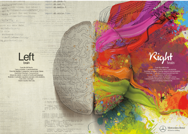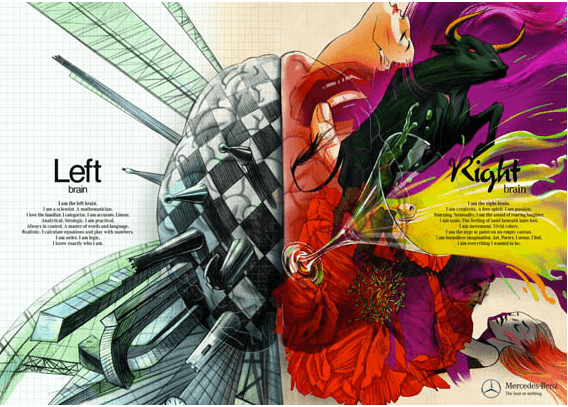 I love this ad campaign by Mercedes-Benz earlier this year. They created different pictures showing the difference between the left brain and right side of the brain and communicated us that Mercedes-Benz combines the latest technology and superior quality with innovation and emotion. The text in the ads read:(Left:) "I am the left brain. I am a scientist. A mathematician. I love the familiar. I categorize. I am accurate. Linear. Analytical. Strategic. I am practical. Always in control. A master of words and language. Realis...tic. I calculate equations and play with numbers. I am order. I am logic. I know exactly who I am."(Right:) "I am the right brain. I am creativity. A free spirit. I am passion. Yearning. Sensuality. I am the sound of roaring laughter. I am taste. The feeling of sand beneath bare feet. I am movement. Vivid colors. I am the urge to paint on an empty canvas. I am boundless imagination. Art. Poetry. I sense. I feel. I am everything I wanted to be."