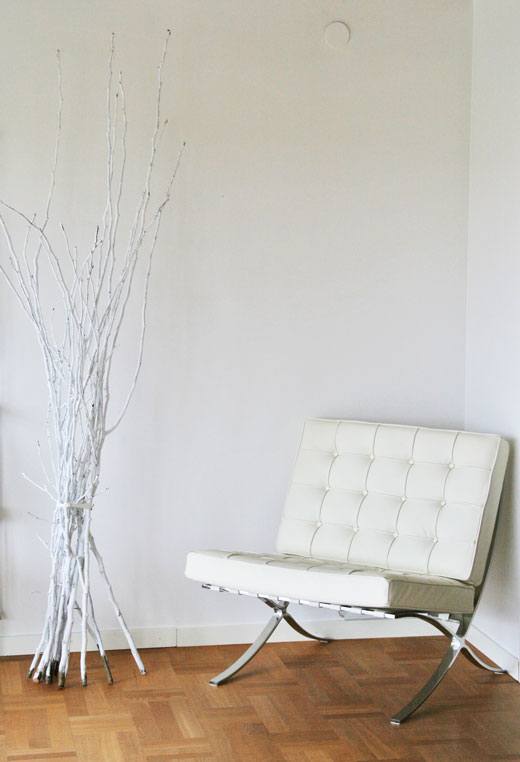 So here it is for now. Maybe even too minimalistic, and the rug isn't working that well, and we still need light fixture and a lamp. And the ottoman that works now as a coffee table/desk is going to be replaced with a coffee table soon. Remember I cut the pear tree in the yard and got hurt? I saved all of the cut branches and painted some of them and they are now in our living room.