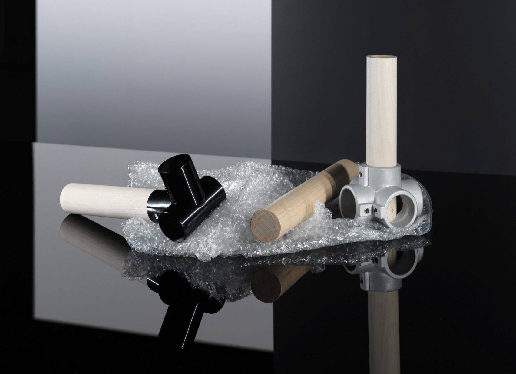 One of the new innovations as a results of the R&D made by Michael Nikolic and his team is the new lightweight hollow veneer tubes. Thanks to inspiration by the materials utilized by NASA for a variety of structures, they developed veneer that's rolled into hollow tubes. The veneer material is made out of wood and recycled materials, and then rolled into hollow veneer tubes. The tubes come in variety of lengths and they can be joined together with connectors.