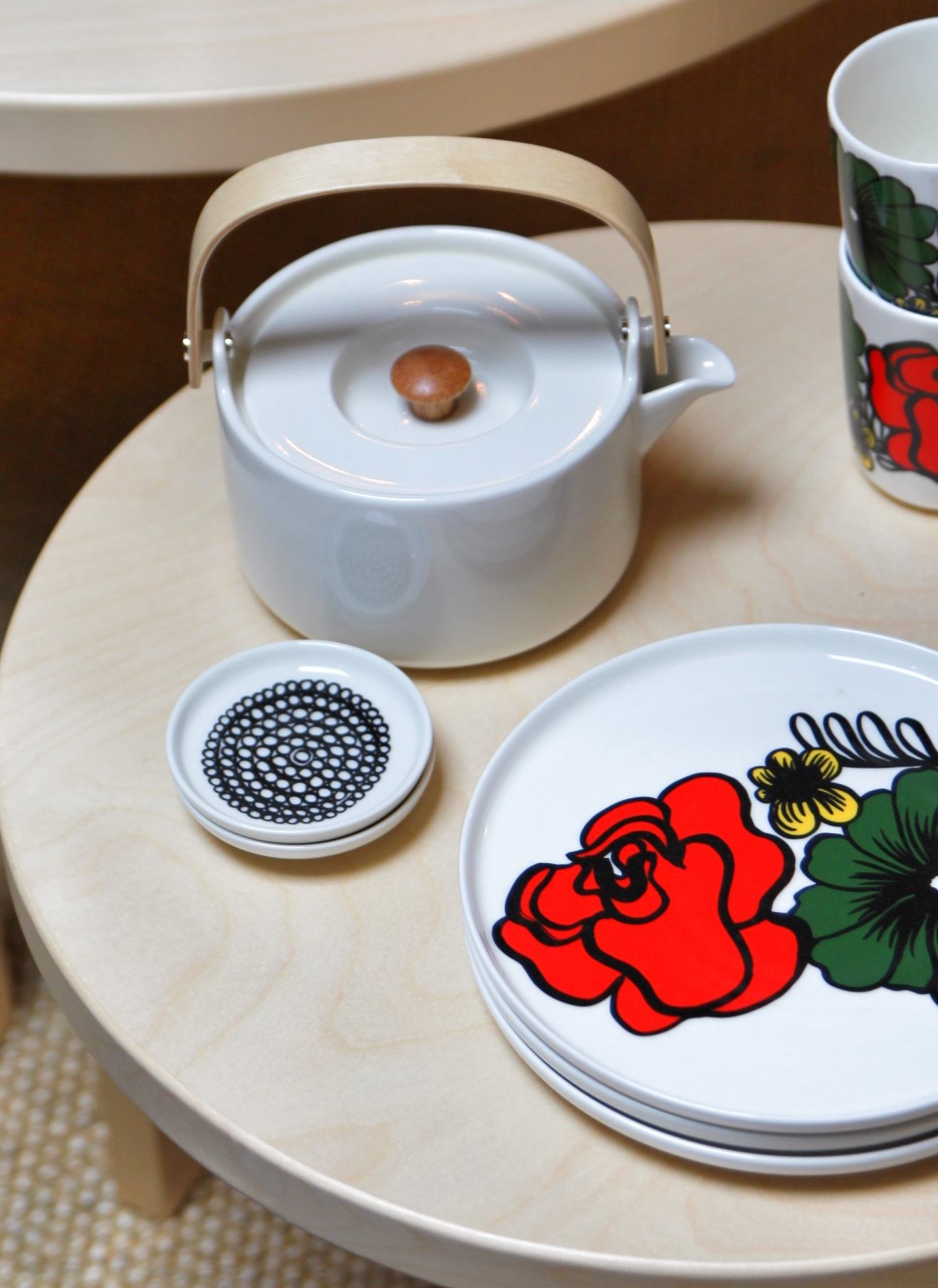 Oiva is also available with Marimekko patterns such as Unikko or Räsymatto, and the Oiva collection includes dishes from coffee and tea cups, mugs, plates and bowls to items like teapots, jugs and pitchers.