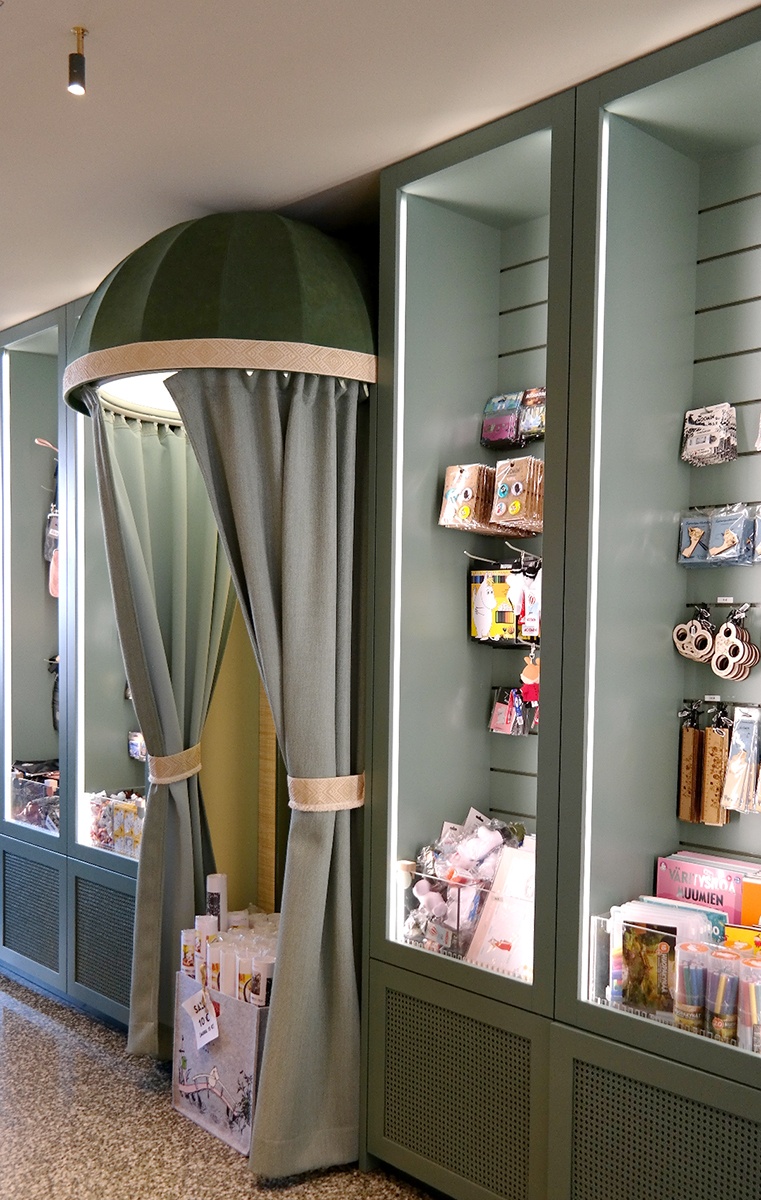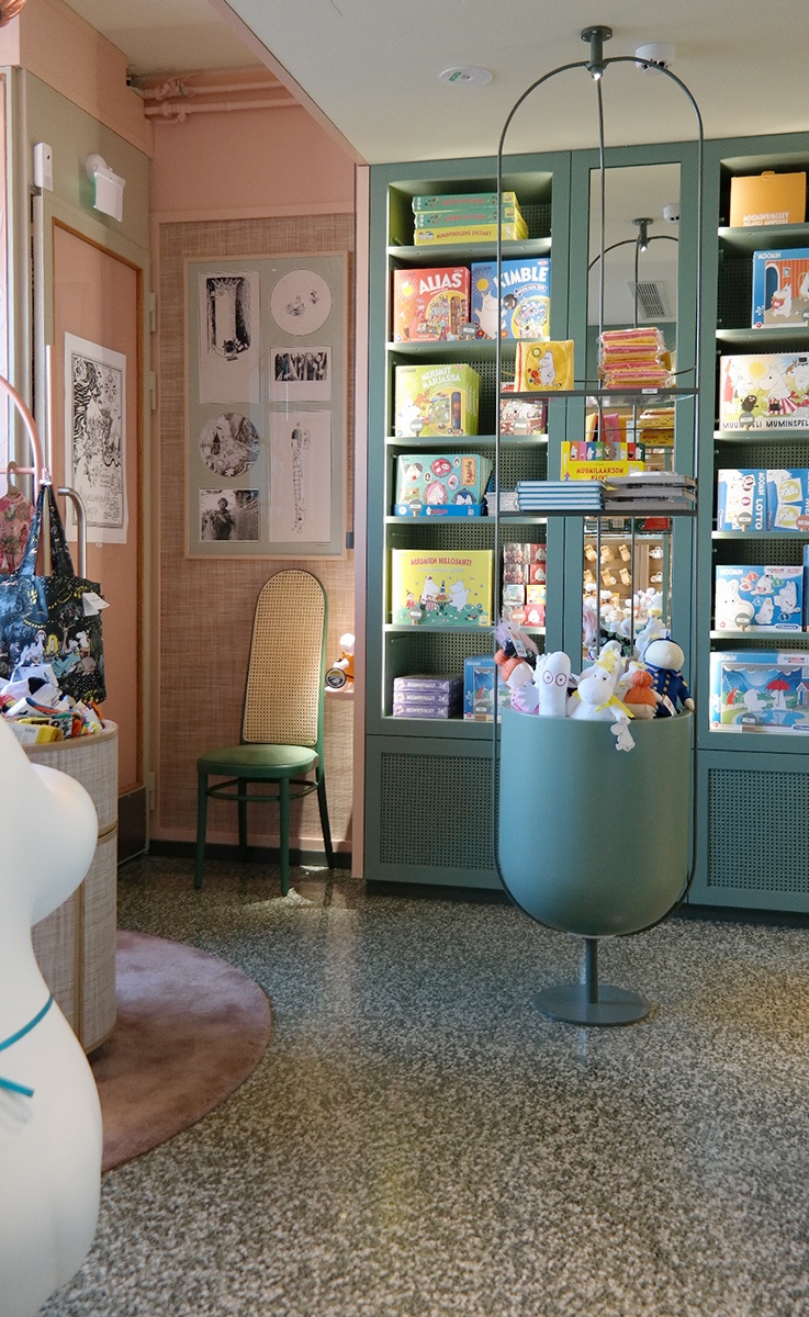 The shop opened in the autumn of 2019 taking on the role of the Moomin’s flagship shop. The interior is based on Tove Jansson’s The Moomins and the Great Flood, published in 1945. It is the first book Tove wrote that features the Moomins, though it’s often seen as a prelude to the stories. It tells of Moominmamma and Moomintroll’s search for Moominpappa and their travels which lead them to Moominvalley. It’s a story of a divided family trying to find each other and a new home.Based on the book’s design, the store is filled with pastel colors of pink and green. It’s a warm and peaceful space with large windows and wicker elements. Around the store, you can find original artwork from the book, celebrating Tove Jansson’s art. It’s not just a store, it’s a space to feel the magic of the Moomins.
