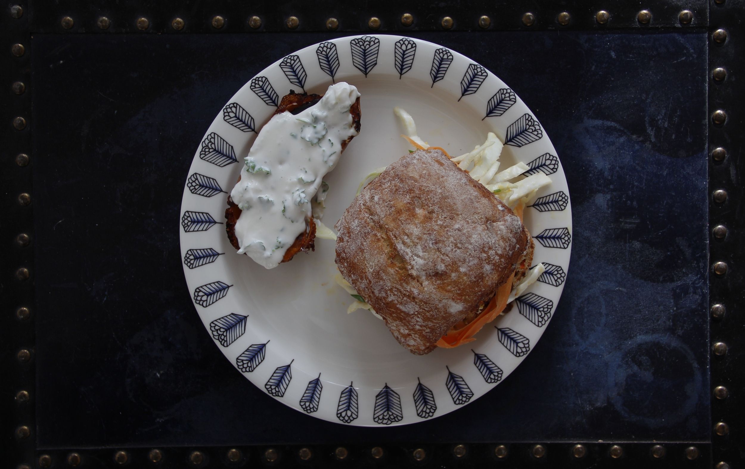 2/3 Oatly crème fraicheJuice of 1/2 orange squeezedParsley choppedOne clove garlic minced smallSqueeze orange juice, chop parsley and mince the garlic and mix with Oatly crème fraiche