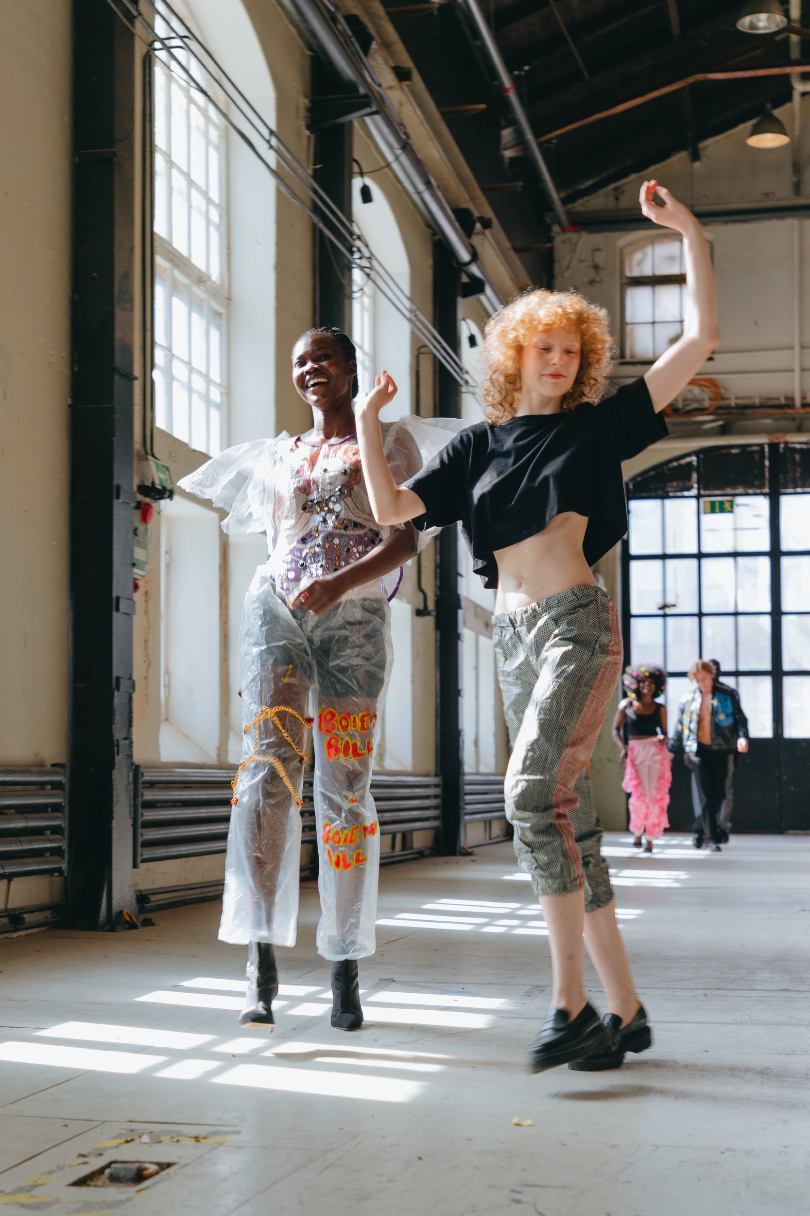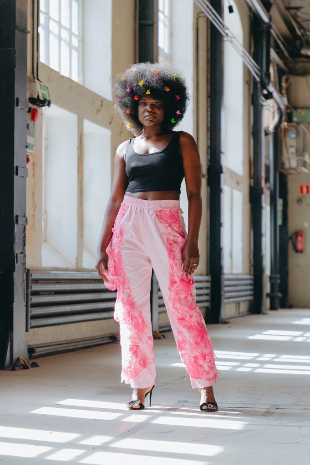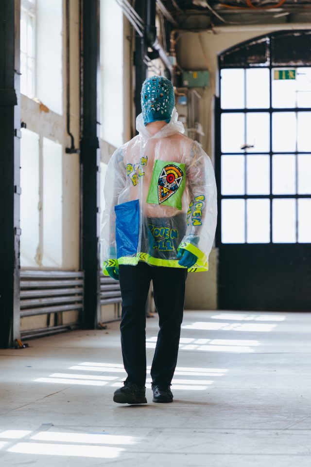 One designer’s work was presented as part of the runway space. Sini-Pilvi Kiilunen, an Aalto University Master’s fashion student, showcased a collection of garments utilizing leftover and recycled materials. While her previous work has been characterized by elaborate materials and described as romantic and intense colors, this collection is focused on construction. Utilizing second-hand shirts and leftover materials, the designs combine masculine and feminine characteristics and shapes.Hailing from Accra, Ghana, BOIE&BILL by Ellisha Boie is a fashion brand that is focusing on sustainable development by preventing and putting to use discarded plastics and second-hand clothing imported into the country’s landfills. The upcycled collection is made up of plastic waste and second-hand clothing from the markets of Accra. Additional materials include broken mirror and glass pieces, fabric and plastic scraps, etc. The brand created an innovative clothing line of raincoats and jackets, to be donated during the rainy season, and tie/dyed second-hand jackets, sweatshirts, jeans trousers, and more. The aim is to promote and draw attention to upcycling and sustainable fashion in Ghana and Africa as a whole.